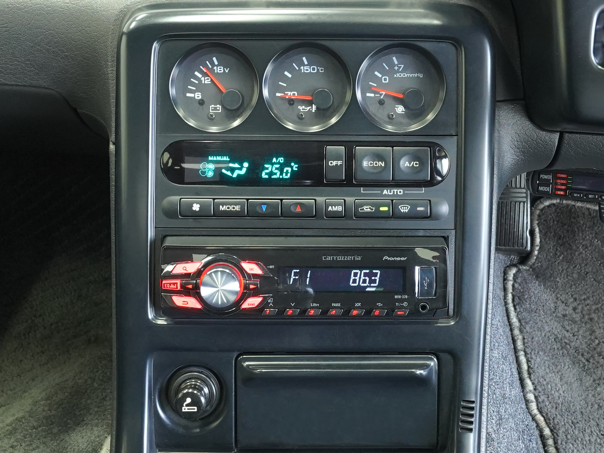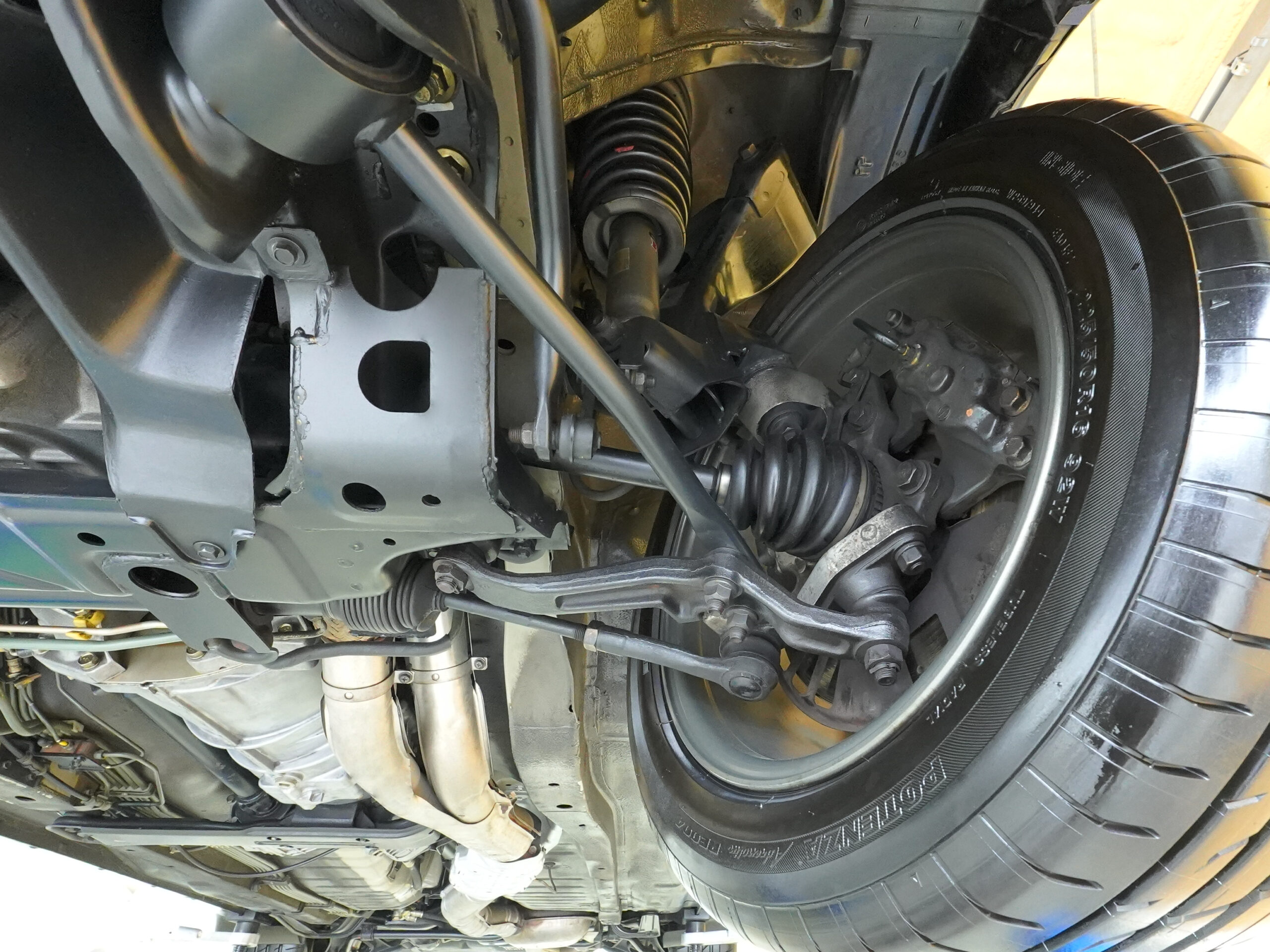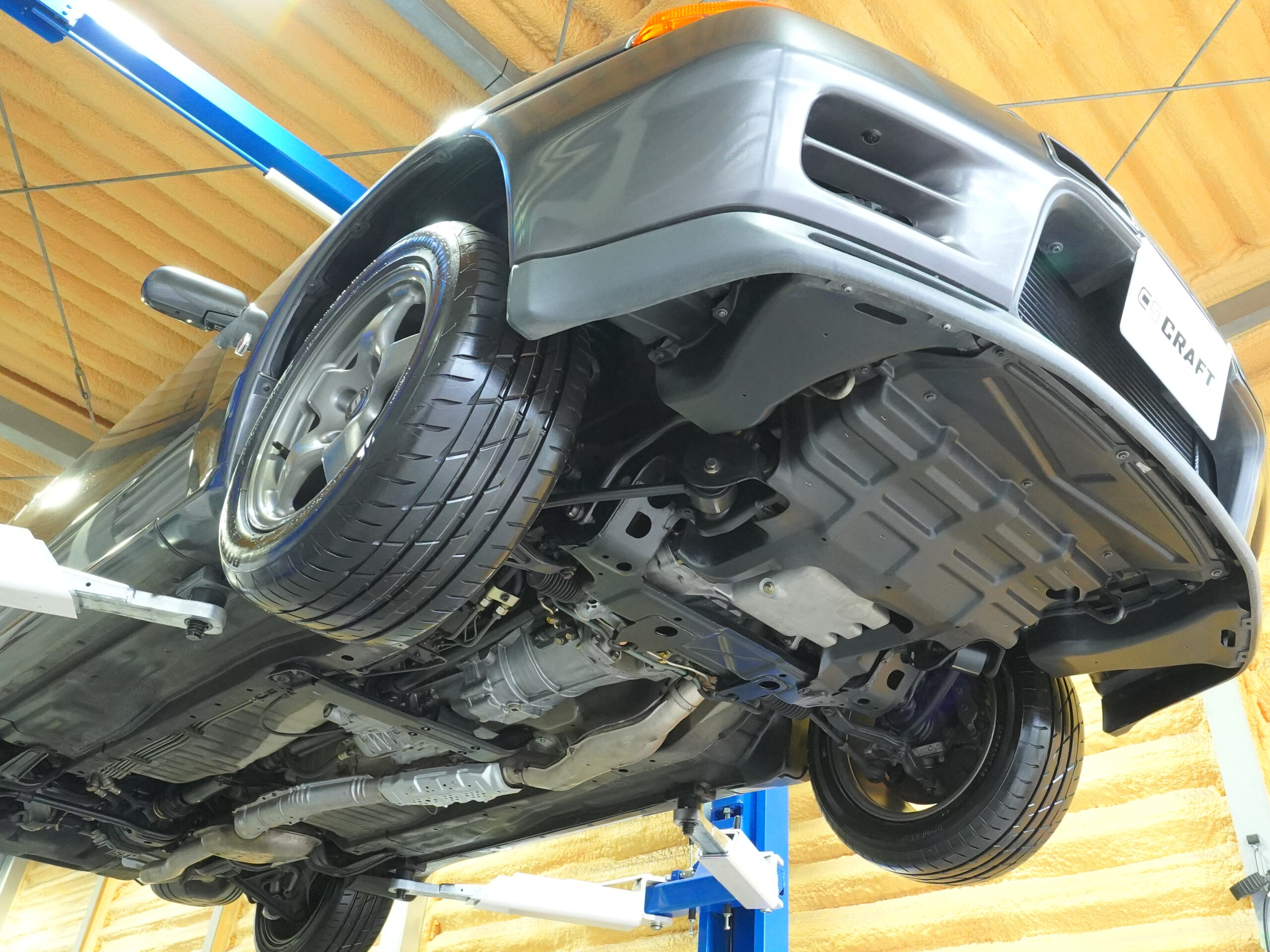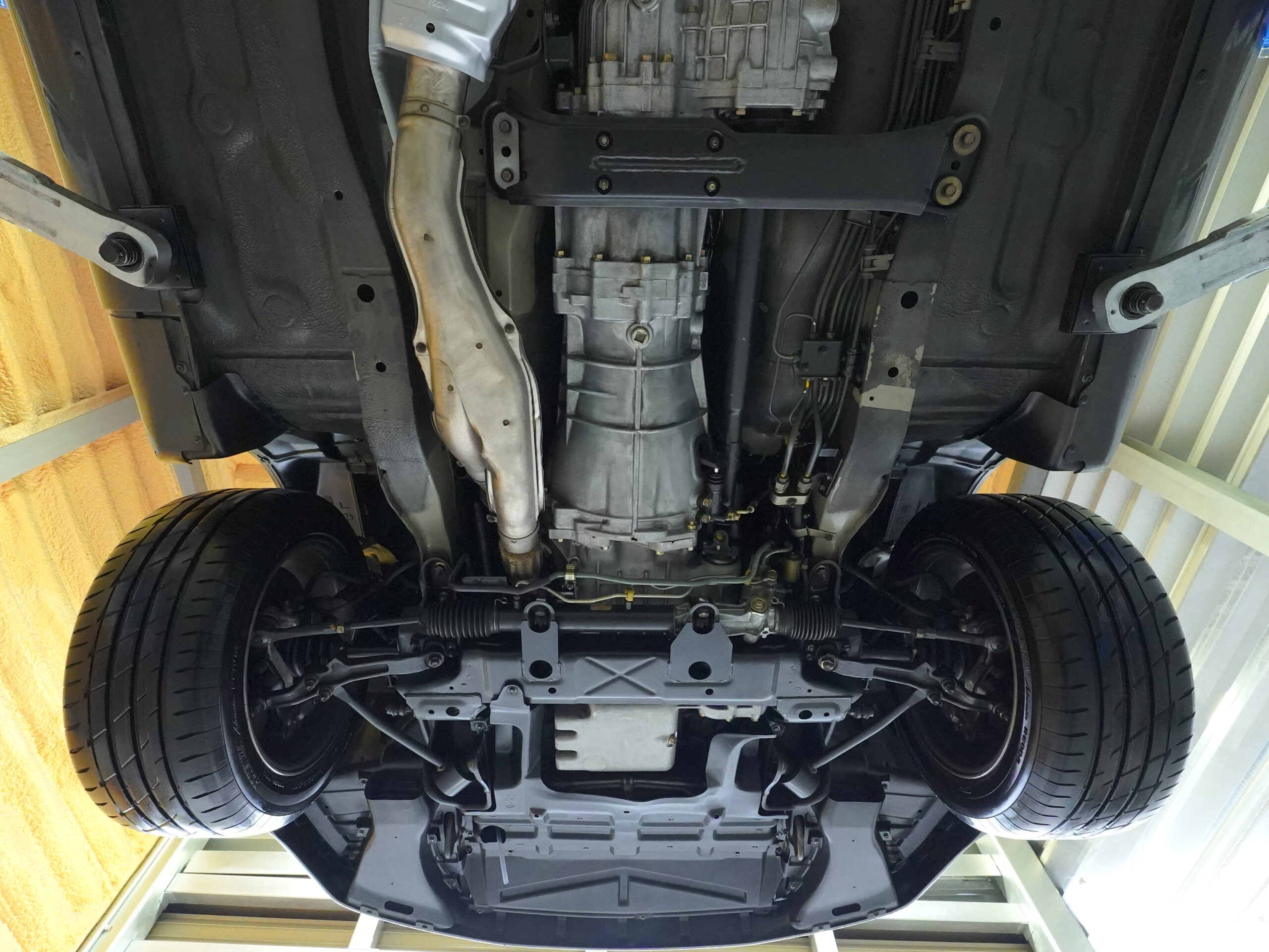 | Interior | Tilt & telescopic steering/Genuine leather-wrapped sports type steering wheel/Genuine leather-wrapped shift knob/Genuine leather-wrapped parking brake lever/central door lock/front torque meter/voltmeter/oil pressure gauge/boost meter/oil temperature gauge/monoform bucket seat/ genuine floor mat |